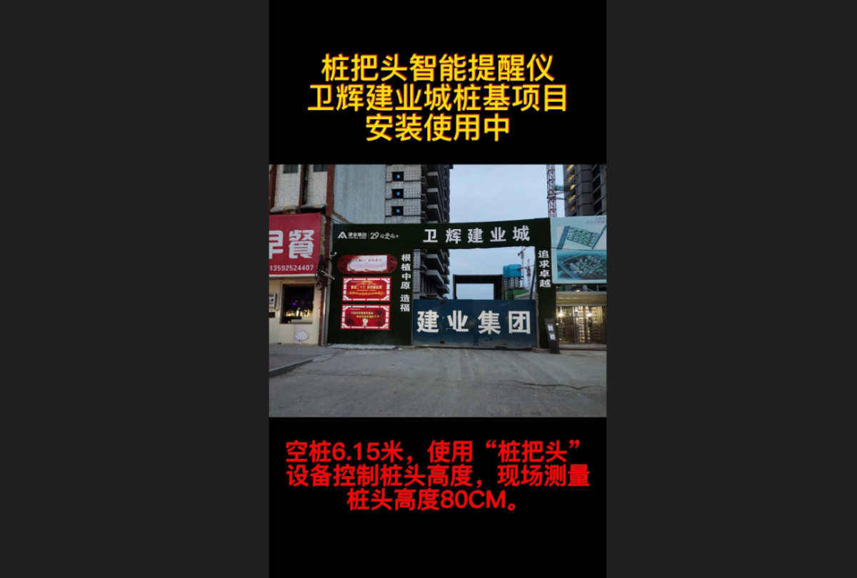 “樁把頭智能提醒儀”新鄉(xiāng)衛(wèi)輝建業(yè)城CFG施工應(yīng)用中,空樁6.15米,使用該設(shè)備控制樁頭高度,現(xiàn)場(chǎng)實(shí)測(cè)樁頭高度為80CM。
